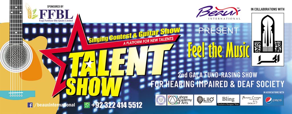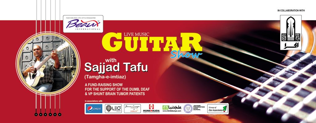 Guitar Show 2016 was a fundraising live music event organized to support Deaf artists and students. The show was held in collaboration with the Lahore Arts Council and was organized by Mueed Farrukh, Creative Director of BEAUX International. The event was supported by and held in association with PepsiCo International, Leo Productions by Dolly, Furniture City, Johar Foundation School, Zia Associates Group, Ilm Ki Dunya, HunerKada, and RN Digital Print.