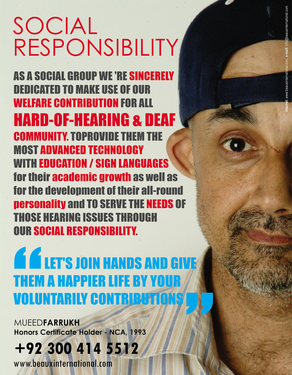 It creates an awareness among the public transport and taxi drivers about the DEAF/Hard-of Hearing student’s needs. All the Lectures of different courses will be viewed through the big screen mounted on the wall or on the projector screen for their better communication between the normal students and all DEAF/Hard-of-Hearing student’s community, with different sign languages through the interpreters. Also my another objective is to develop a Noble Cause Hospital in Lahore with all free medical facilitates as given below Audiology Department, Speech Therapy Department, Rehabilitation Department Surgical Department, Hearing Test, Wax Removal and Free Medical Services, Medical Camps and Hearing Screening Tests will be provided in all Schools, Colleges and Universities in Pakistan.